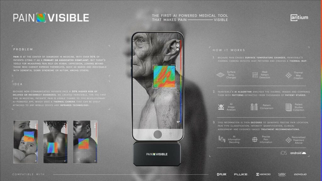 PainVisible nace precisamente para responder a estas preguntas. Fruto de la colaboración entre Aritium, VML Health y WideLabs, esta herramienta médica pionera en el mundo utiliza imagen térmica e IA (Inteligencia Artificial) para ver, analizar y cuantificar el dolor de manera objetiva, en tiempo real y sin necesidad de palabras.